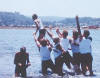 The Husky varsity launching Eric Cohen after victory on Opening Day. Said John Zevenbergen of his emotional coxswain, "I can't even understand what he's saying sometimes, but I always know what he means." Tom Cohen photo | ||||