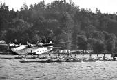 The team rowing past the brand new Boeing 314 Clippers moored at Sandpoint for testing. The Clippers would go into service in 1939, but production was limited to only twelve. With a wingspan of 152 feet, the Clippers were a double-decker ultra-luxury mode of travel overseas, with a flight from San Francisco to Hawaii taking 19 hours (with seats that folded into bunks) and included a dining area and lounge. Erickson collection