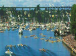 On May 3rd the event went off on a sunny day in front of an estimated 50,000 fans lining the log boom and the Montlake Cut. The JV's, in a furious finish, came from behind to defeat the Bruins by about a half length. In the featured event of the day, UCLA shot out of the gate to lead early in the race with Washington getting a typically slow start, then slowly drew away, leading by six seats with 500 meters to go. But at that point the Huskies began to sprint, rapidly closing the lead. The crews crossed the finish line almost dead even, both timed in 6:04.9, but there was enough margin to call UCLA the victors. Jerry Johnsen, Washington class of '64 and now head coach at UCLA, noted "it's nice to come home to a city that knows what crew is and get a welcome like this before such a big crowd." Dick Erickson was notably silent (at least publicly) other than to call the first time event a "majestic site".