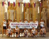 After a one year hiatus, the team was back again in Egypt for the December Festival of Oars, this time sponsored by Nordstrom. Back row: Regan Broussard, Ty Graham, Jim Dahl, Chris Pugel, Dave Zevenbergen, Blair Horn, Sam Eastabrooks, and Ed Ives. Front row: Jim Lovsted, Lee Miller, Todd Landweur, and Rob Anderson. Dick Erickson Collection, added 3/23 | ||||
