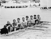The Egypt trip team, left to right (back): Uglesa "Jan" Janjic, Al Erickson, Al Forney, Guy Lawrence, Dave Lauber, Greg Hoffman, Gary Dohrn, Blair Horn; front: John Christensen, Charlie Van Pelt, Gary Evans, Mike Crustolo, Nabojsa Janjic. The eight from this team lost to the U.S. Olympic eight by four feet in Cairo. Husky Crew photo. | ||||