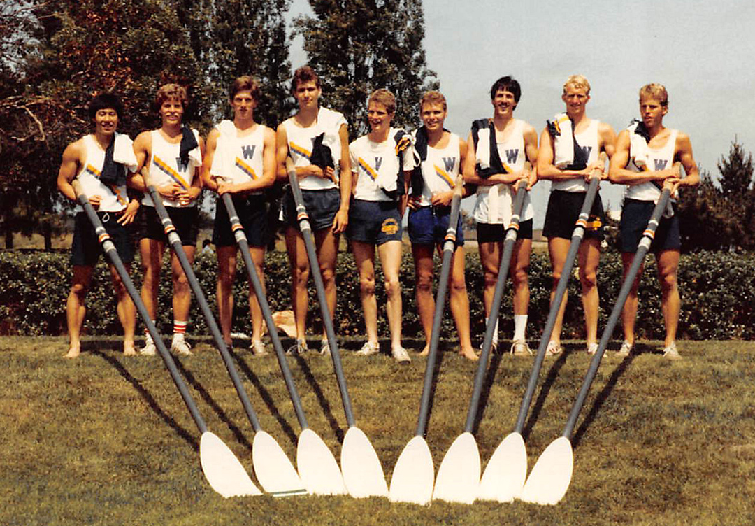 The 1983 varsity, left to right: Lee Miller (cox), Ed Ives, Dave Zevenbergen, Blair Horn, Todd Landwehr, James Snody, Pat Gleason, Jim Dahl, Brad Clancy. Washington Athletic Department photo. | ||||