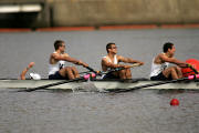 Men's V8 Final: Cal wins by 2 seats; Washington 2nd, Harvard 3rd. Cal blows out to an open water lead by 750 meters with a high-stroking charge; Huskies at a lower stroke rate attempt to reel them back in the last 1000, sprinting the last 400m; Harvard strong in lane 4 goes with them and it is a three boat nail-biter at the finish, with Cal prevailing across the line. JAMCO - 2009 San Diego Crew Classic - Men's Copley Eight Grand Final